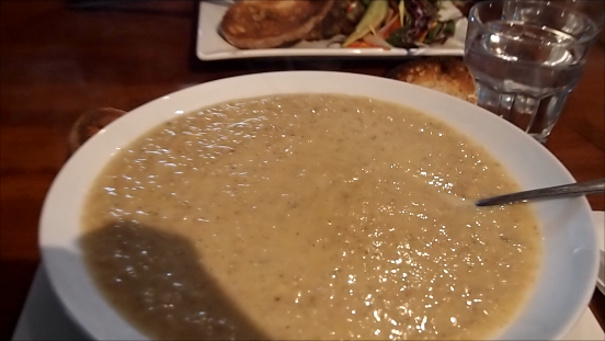 | My Lunch Bacon, Potato and Leek soup with 2 pieces of Sourdough bread |